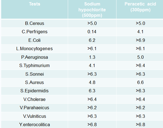 ประสิทธิภาพของกรดเปอร์อะซิติก มีดังนี้ :